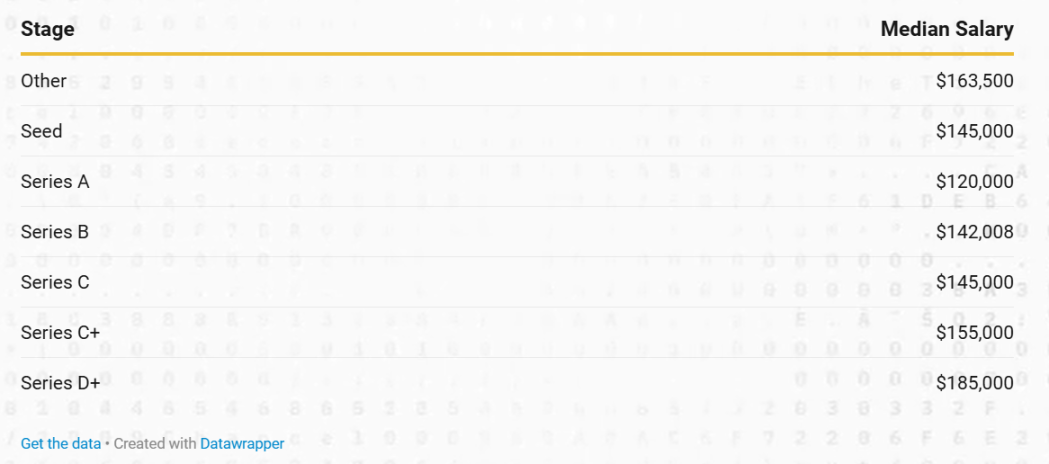 从公司阶段来看,种子阶段组织的中位数薪资为 145,000 美元,A 轮公司略降至 120,000 美元。B 轮公司的中位数为 142,008 美元,C 轮回升至 145,000 美元。薪资在 C 轮及以上阶段继续增长,C 轮 + 为 155,000 美元,D 轮 + 为 185,000 美元。所有阶段的综合中位数薪资为 140,000 美元,总体平均为 145,725 美元。