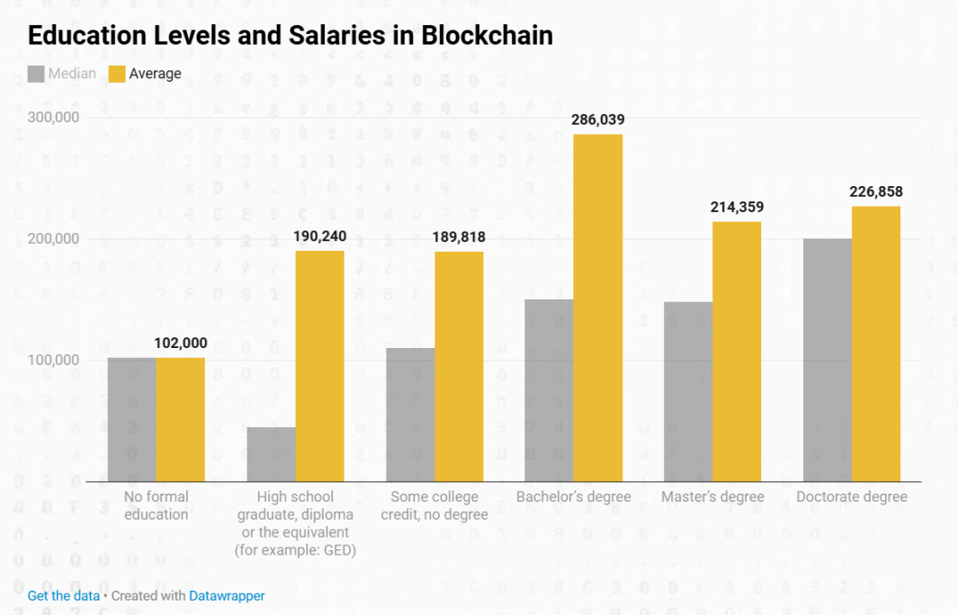 今年我们研究了产业内的教育背景,发现了一些有趣的结果。对区块链专业人士教育水平的分析揭示了关于继续教育经济回报的趋势: