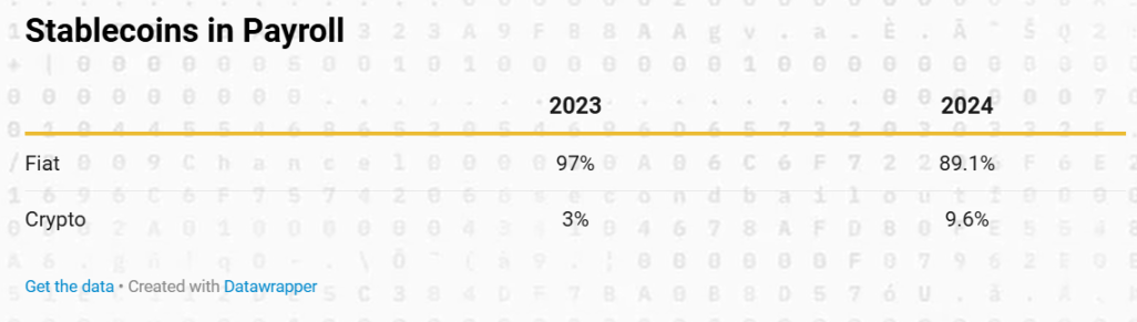 2024 年,以加密货币领取薪酬的比例从 2023 年的 3%增长至 9.6%,增长了两倍。这一增长凸显了数位资产薪酬的转变趋势,以及稳定币支付管道的普及。在加密货币薪酬中,稳定币是首选支付方式。稳定币 USDC 和 USDT 占据主导地位,大多数以加密货币领取薪资的人选择 USDC。