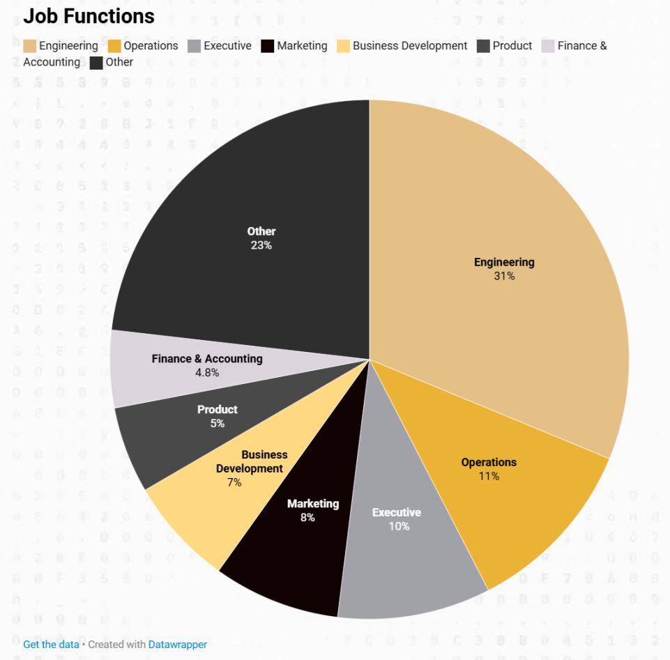 职业职能包括工程、营运、市场行销、设计、业务发展、产品管理、高阶主管领导、财务与会计、法律等。