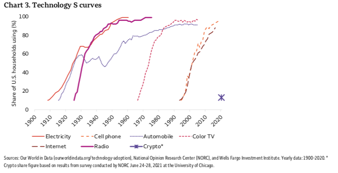 富国银行(Wells Fargo)等机构的研究则为这个比喻提供了资料支撑。研究报告显示,加密货币的使用者采用曲缐与 1990 年代初期的网际网路惊人地相似。即便网际网路诞生于 1983 年,但直到 1995 年,全球也仅有不到 1% 的人口在使用它。这个数位与今天的加密货币使用者占比何其相似。历史表明,颠覆性技术在迎来爆发前,都需要经历一个漫长、缓慢且让大眾感到困惑的爬坡期。