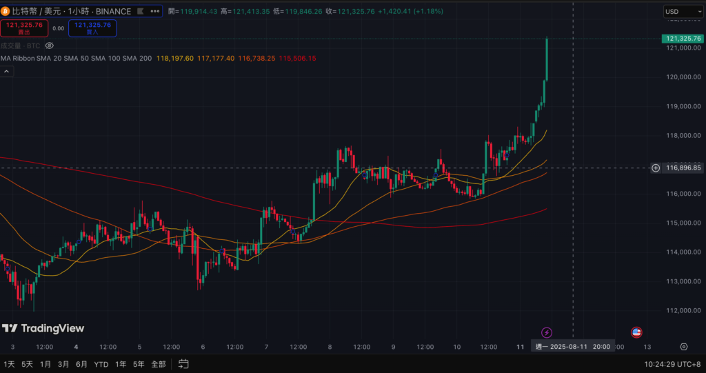 比 特币 (BTC) 8 月 11早上再写里程碑,比特币现价约 121,367 美元,日内涨幅 3.8%,正式站稳 12 万美元整数关卡。这是今年以来最亮眼的单日收盘价,也让多头资金情绪升至高点。