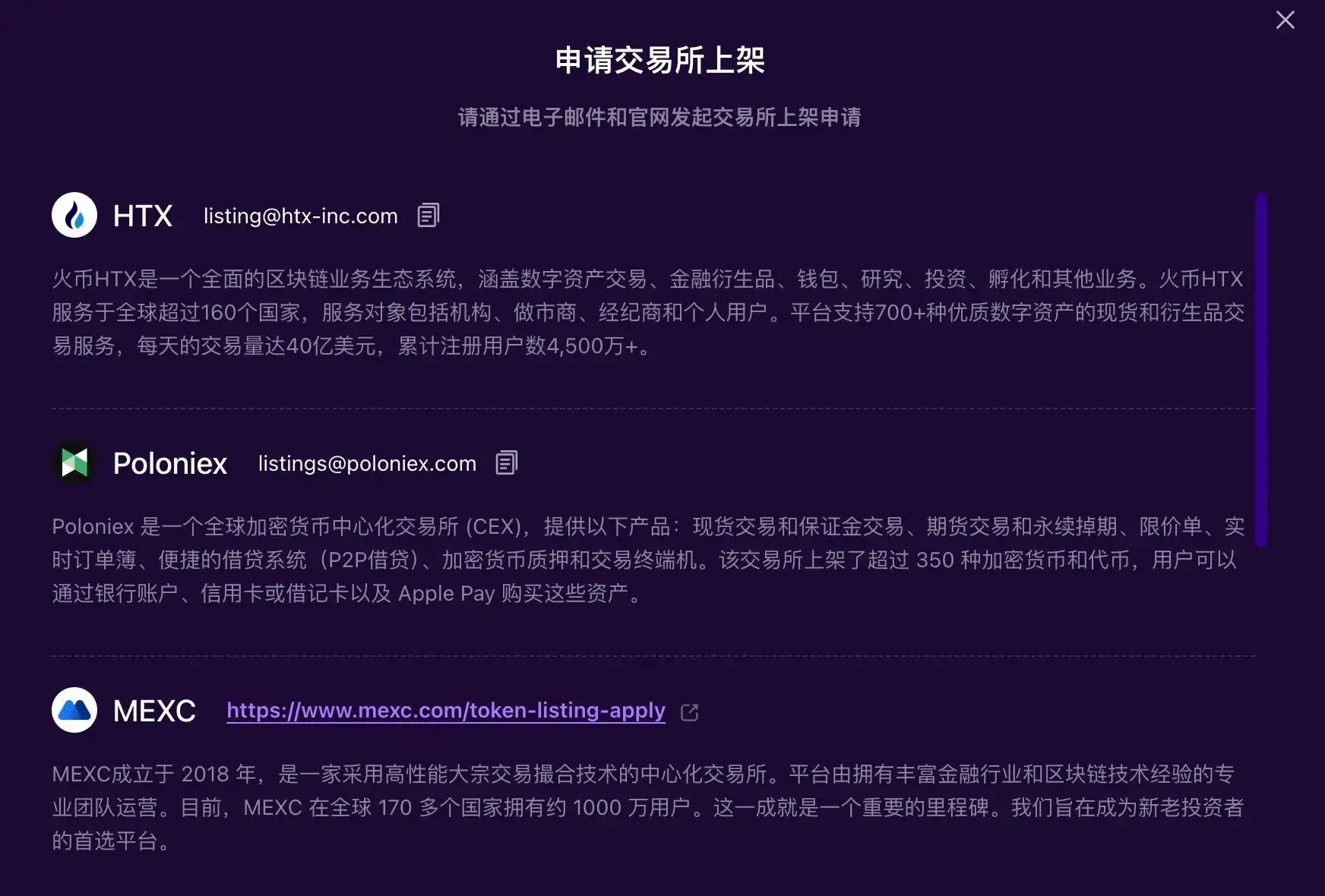 目前, Meme 项目可在 SunPump 官网发起交易所上架申请,SunPump 已开放HTX、Poloniex、MEXC、Bybit、Gate、KuCoin及 BingX 共七家主流交易所的快速通道。