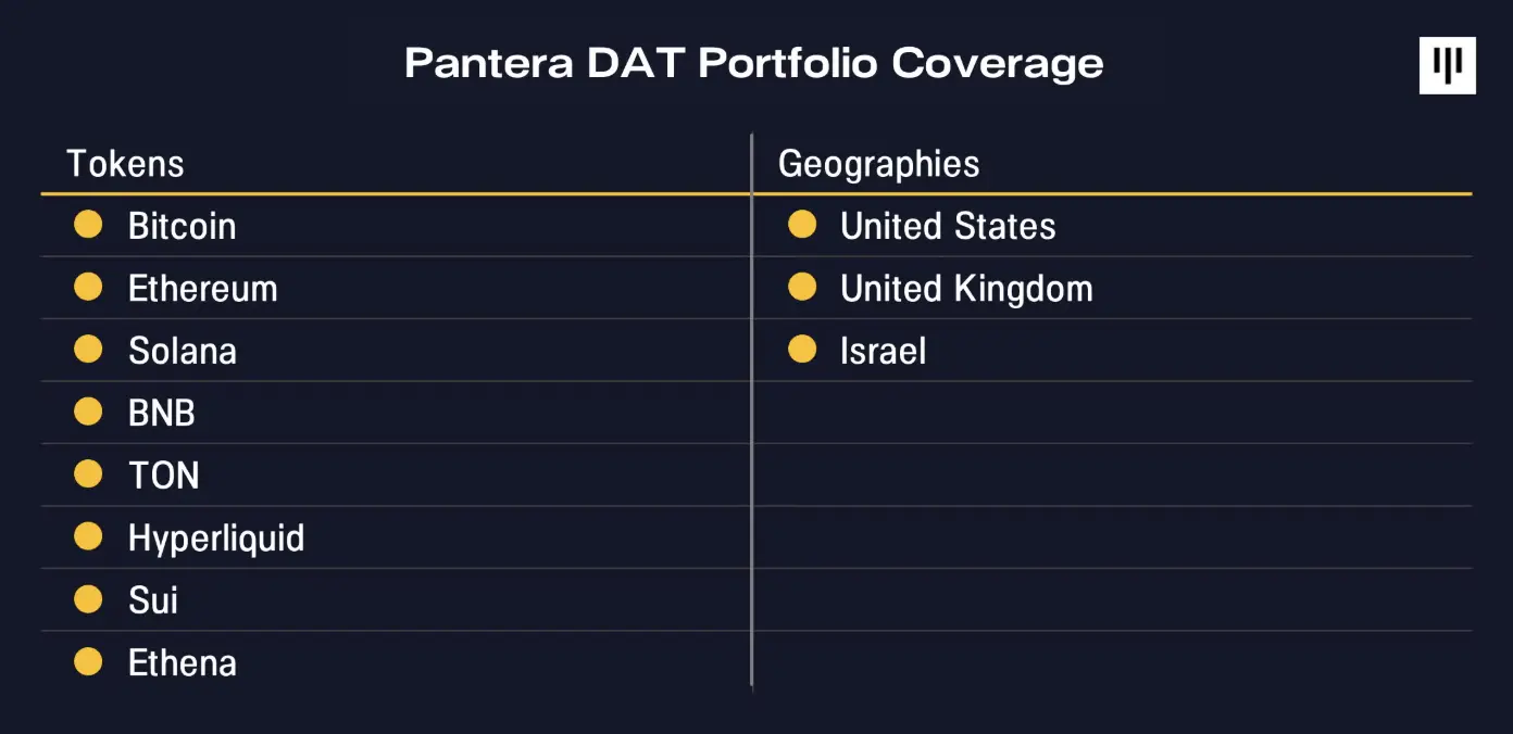 Pantera 已向不同地区以及聚焦不同代币的 DAT 投资了超 3 亿美元资金。这些 DAT 正利用其独特优势,通过每股增值策略扩大其数字资产持仓。以下是我们的 DAT 投资组合概览。
