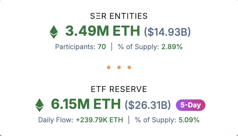 当前,越来越多机构将以太坊纳入核心战略。根据 strategicethreserve.xyz 最新数据显示,截至8月12日,已有70家公司囤积了约349万枚ETH,价值接近150亿美元,占以太坊总供应量的2.89%。
