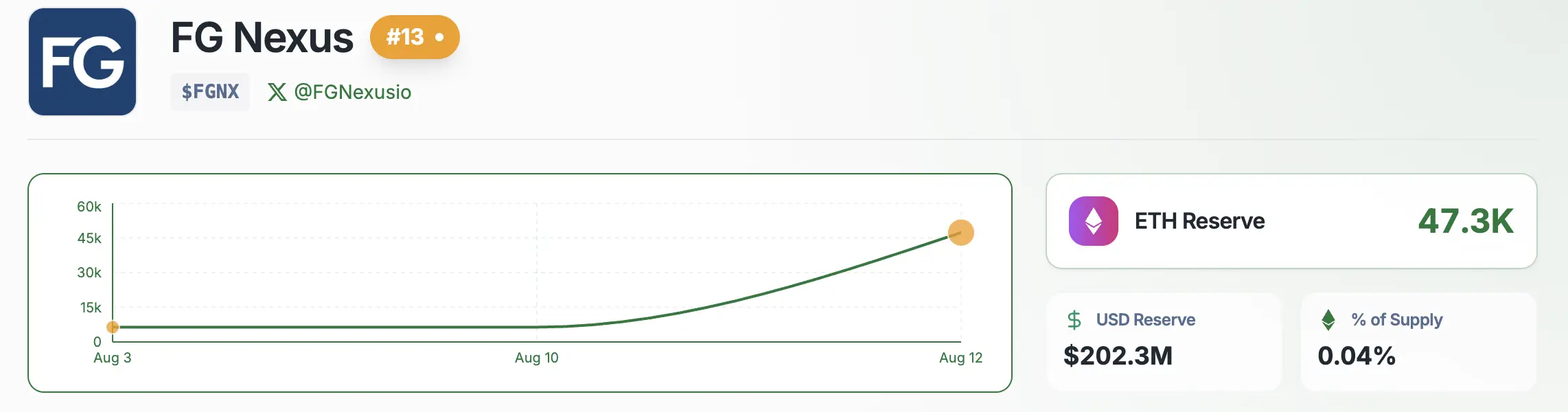 这笔私募融资已在8月初正式完成,吸引了加密领域重量级机构参与,包括Galaxy Digital、Kraken、Hivemind Capital、Syncracy Capital、Digital Currency Group(DCG)及Kenetic等。多家以太坊财库公司幕后操盘手 Galaxy Digital ,同时被任命为FG Nexus的战略顾问,负责管理其以太坊国库,提供资产管理、收益执行和基础设施支持。