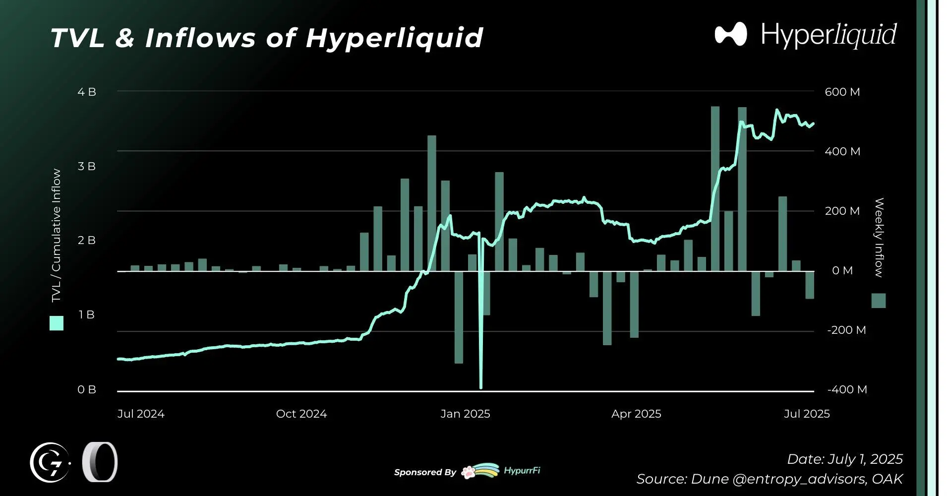 正因持续增长,Hyperliquid 在 2025 年上半年进一步巩固了其在去中心化永续合约交易领域的主导地位。截至 6 月 30 日,平台 TVL 已达到 35 亿美元,较年初的 21 亿美元增长70.8%。 同期,尽管 3 月经历了 5.9 亿美元的净流出冲击,整体资金流入仍保持强劲,平均每周净流入5800 万美元