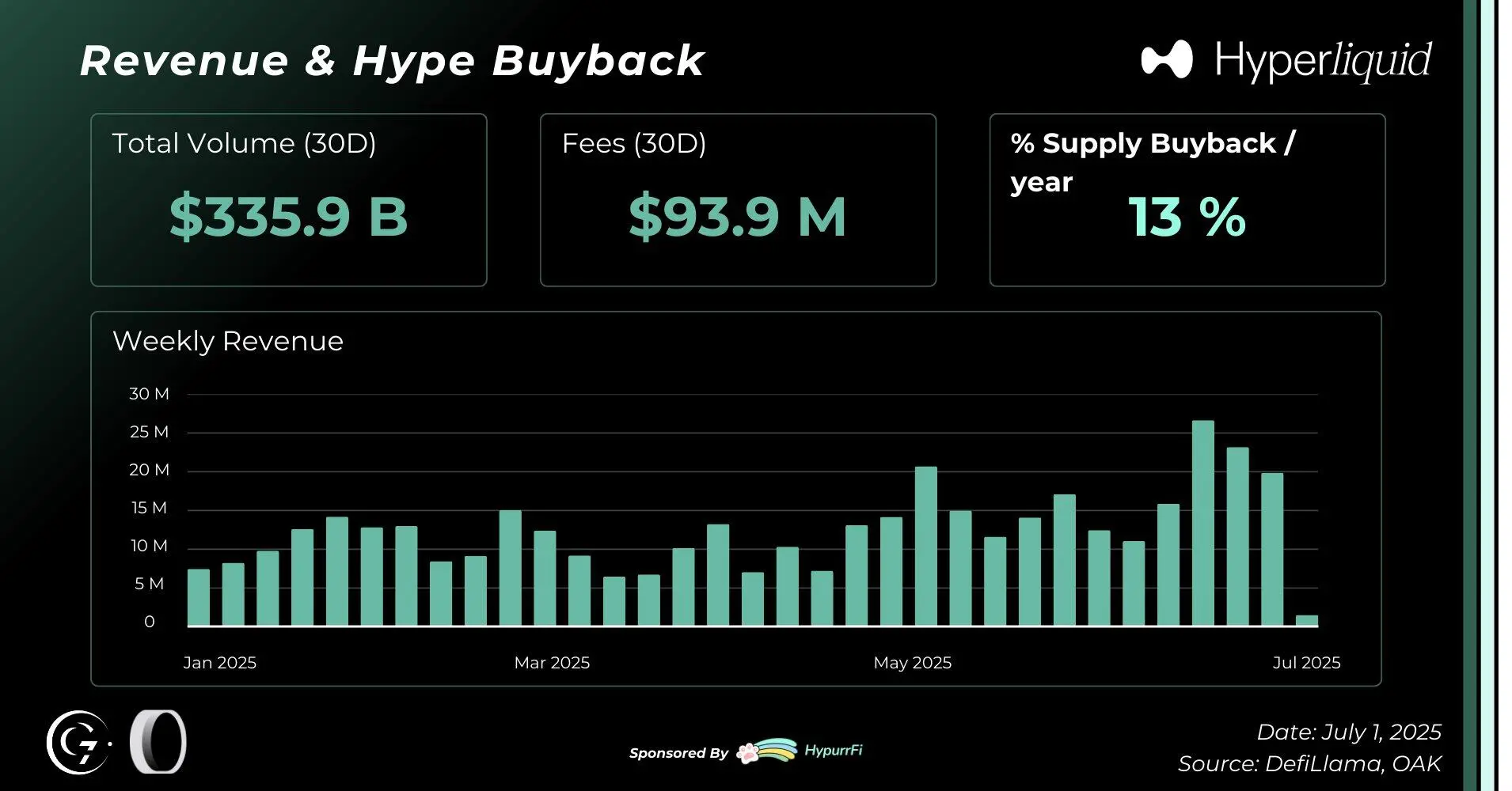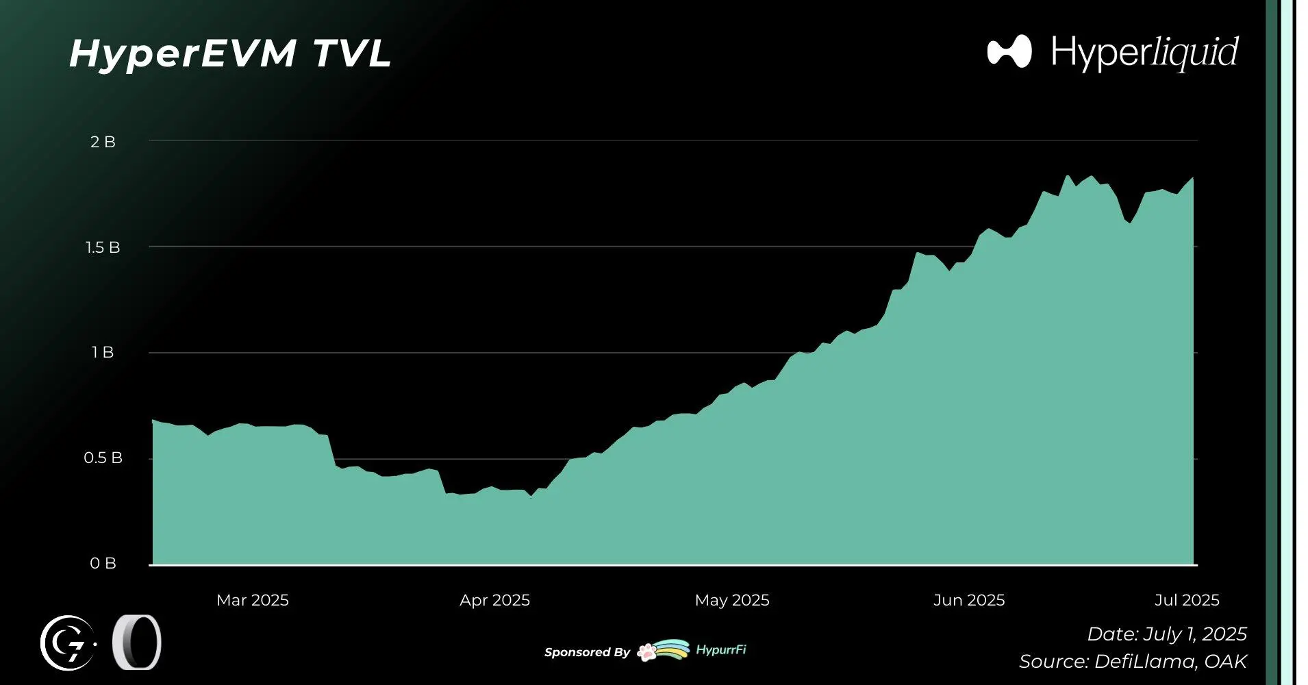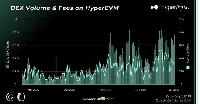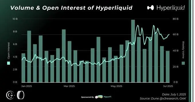 2025 年上半年,Hyperliquid 继续巩固其在去中心化永续合约市场的领导地位,链上各项指标表现出色,HyperEVM 的采用速度加快,本土应用生态迅速扩张。HYPE 代币在独特回购机制和创纪录收入的支持下表现稳健,彰显了协议经济模型的可持续性。