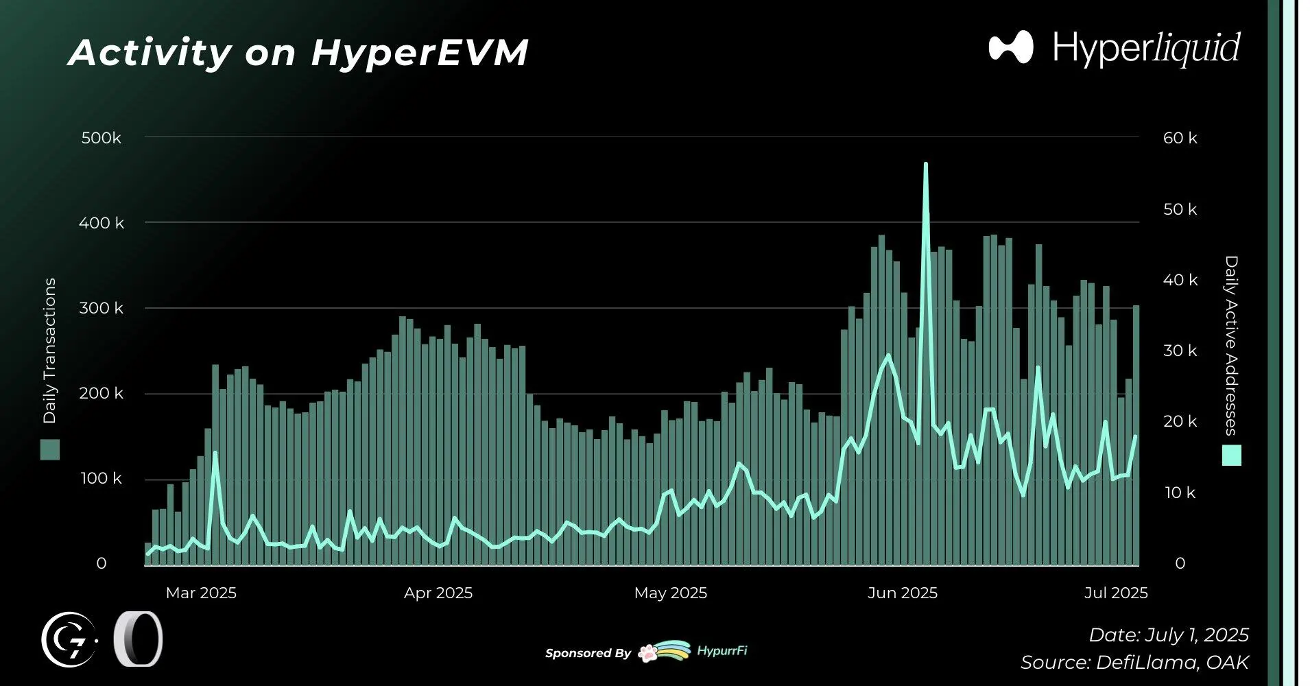 2025 年上半年,HyperEVM 的用户活跃度稳步提升,平均每日活跃地址约为 3.3 万,6 月份高峰周超过 4.4 万。