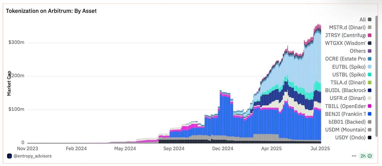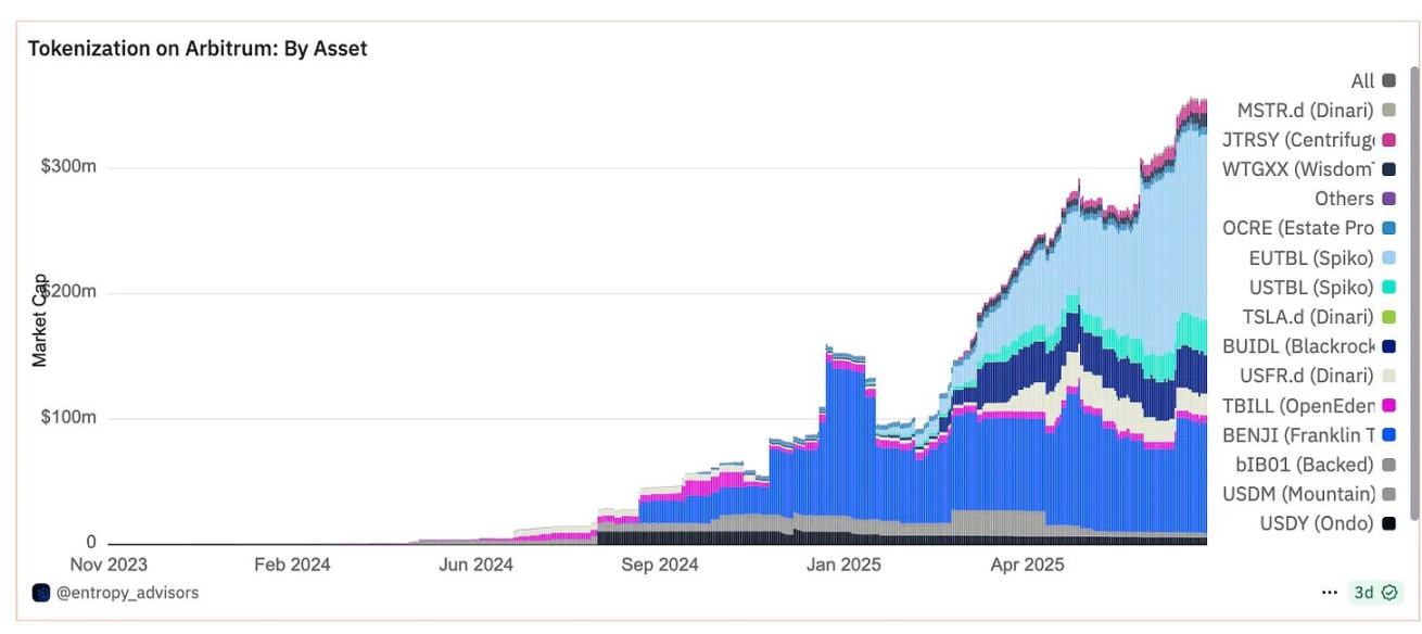 Arbitrum 的 RWA 总锁仓价值(TVL)在短短一年多时间里,从近乎零增长至 3.5 亿美元。