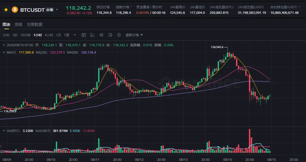 比特币市场在 8 月 15 日上演惊魂一幕。在创下124,500 美元历史新高仅数小时后,比特币价格突然调头向下,急速跌破 117,500 美元关键支撑位,日内跌幅达 4.24%,最低触及117,000 美元水平。这场高达 7000 美元的暴跌如同冷水倾盆,浇熄了市场刚刚燃起的狂热情绪。