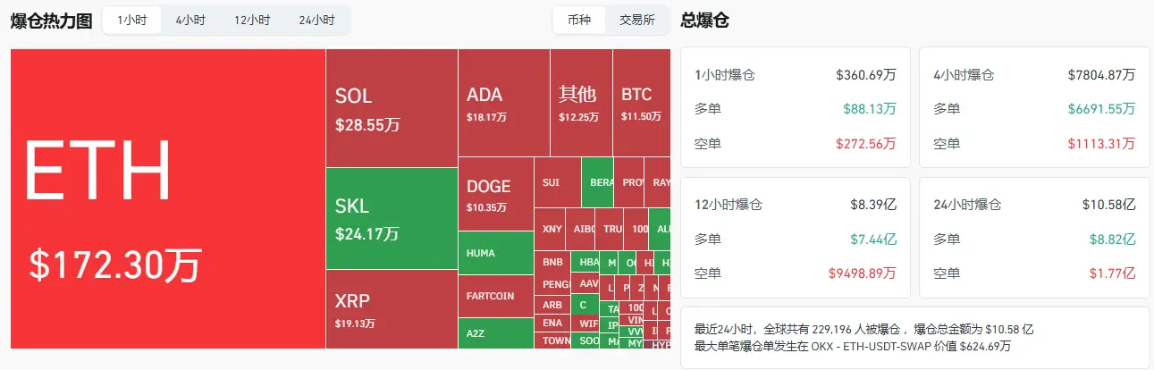 这场闪崩并非孤立事件。加密市场总市值 24 小时内蒸发 3.9%,跌至 4.09 万亿美元。以太坊跟随比特币同步下挫,跌破 4500 美元关口,现报 4568 美元。