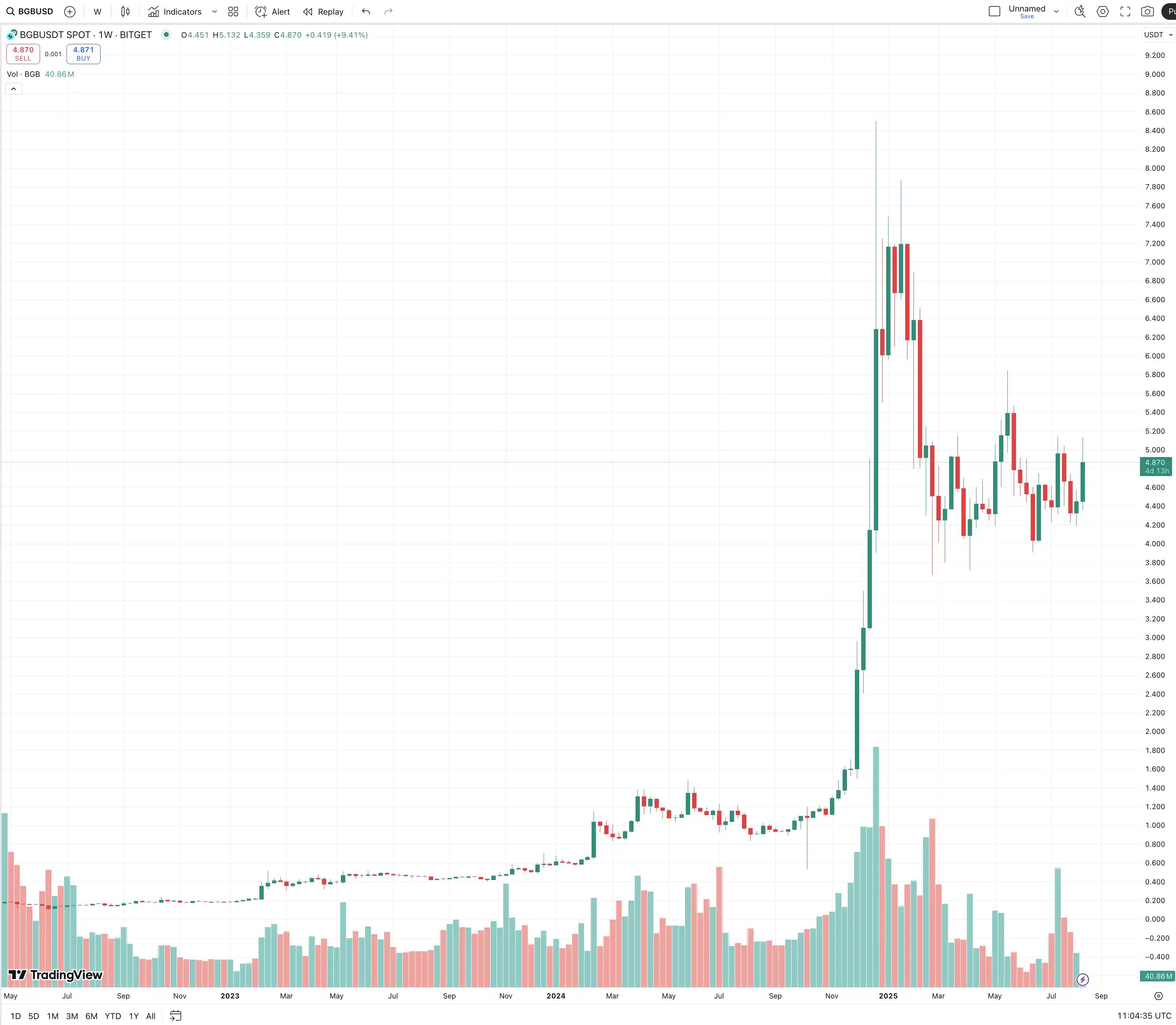 从 2023 年初的 0.20 美元,到 2025 年站上 5 美元,BGB 在两年内走出了一条几乎 25 倍的曲缐。