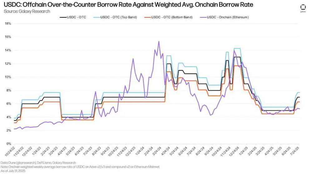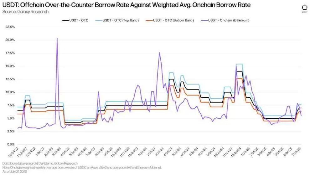 下图跟踪了 USDT 的相同利率。自 7 月初以来,USDT 的链上和场外利率比 USDC 更为接近。