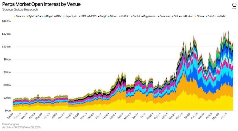 按未平仓合约计算,Binance 在永续期货市场中占据最大份额,占比 20.83%。其次是 Bybit(15.41%)和 Gate(12.85%)。截至第二季度末,Hyperliquid 的未平仓合约为 75.16 亿美元,占永续期货市场总份额的 6.91%。