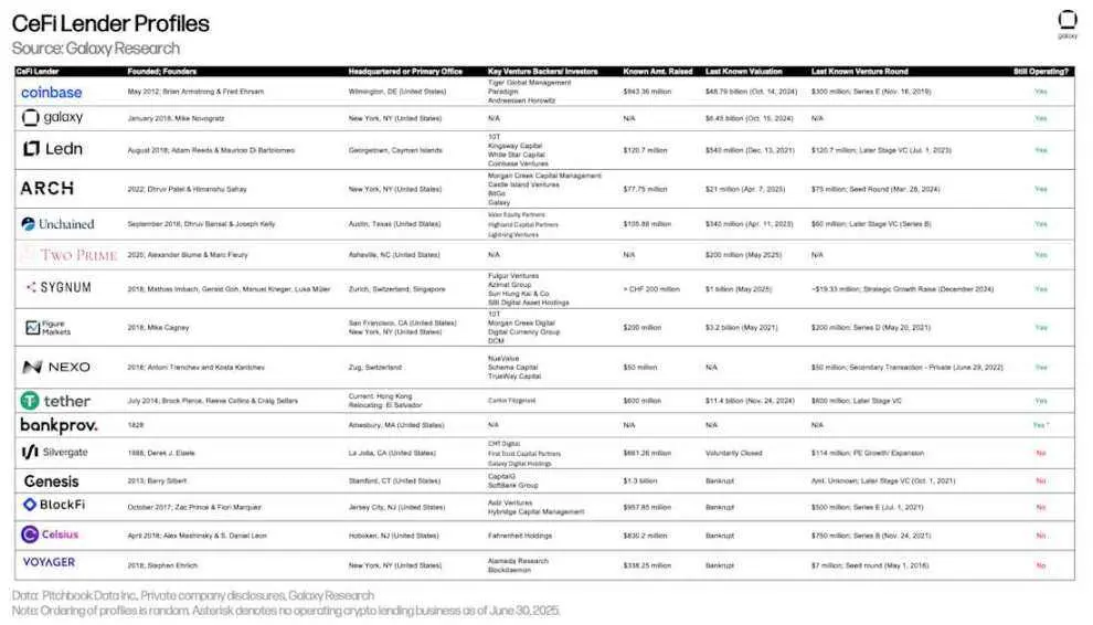 下表对比了市场分析中的 CeFi 加密货币贷款机构。部分公司为投资者提供多种服务。例如 Coinbase 主要作为交易所运营,但也通过场外加密货币贷款和保证金融资向投资者提供信贷。然而分析仅涉及其加密货币抵押贷款的规模。