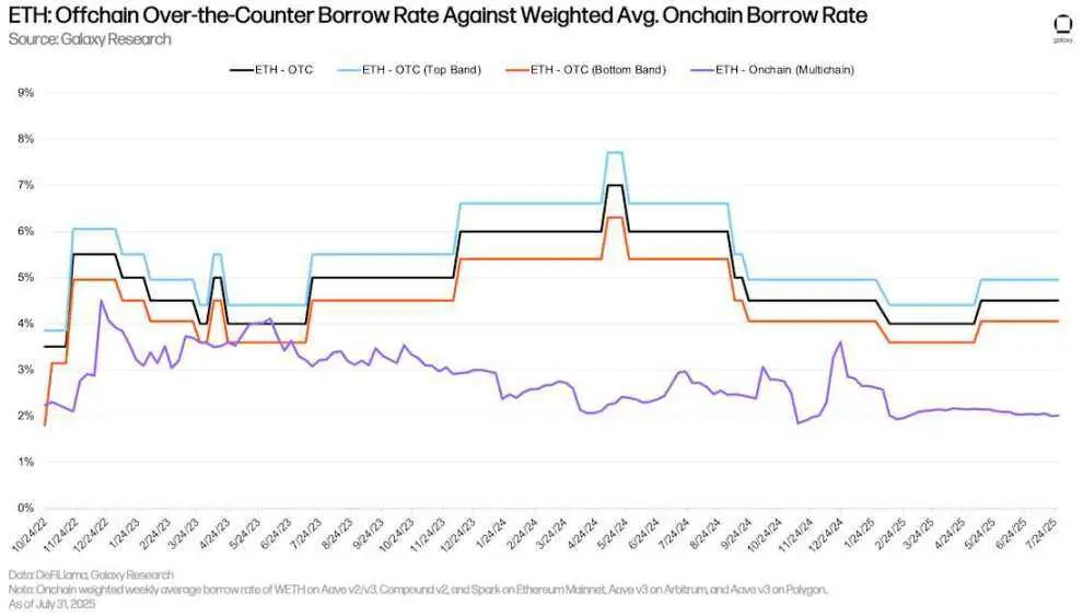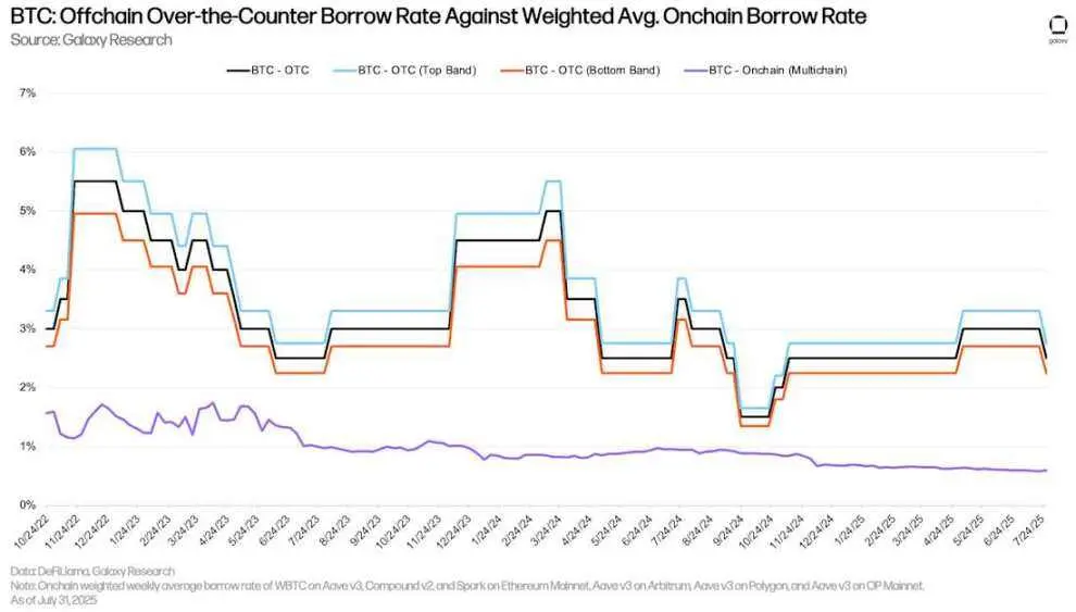 4 月初,随着市场从「解放日」低点强劲反弹,场外 BTC 利率小幅上升。然而,随着 7 月底市场降温,利率回落至第二季度初的 2.25% 水平。