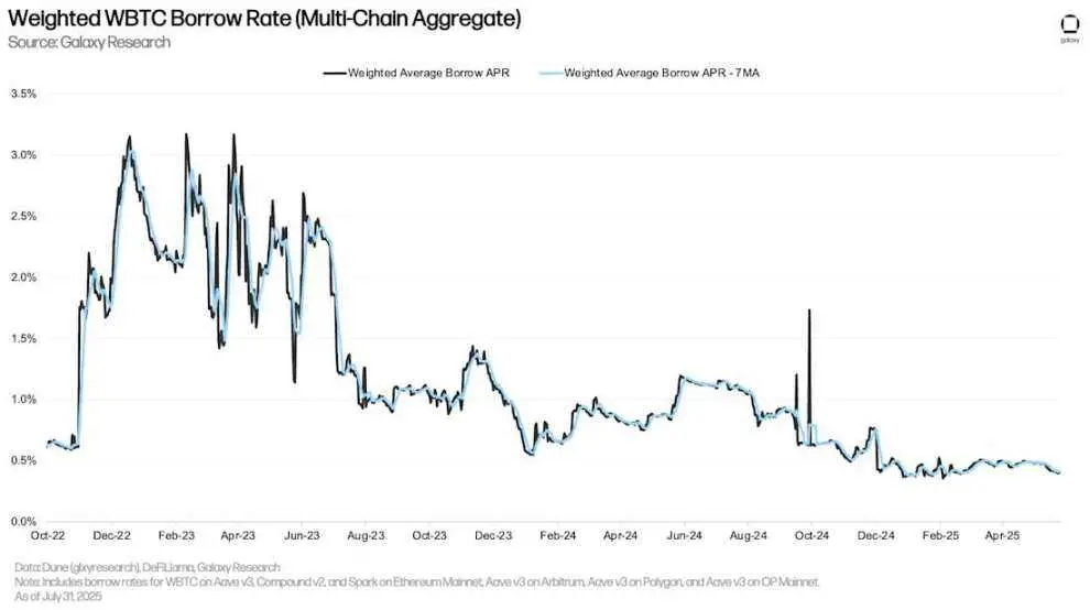 链上与场外 BTC 借款利率的历史分化在第二季度持续存在。在场外市场中,BTC 的需求主要由两个因素驱动:1)做空 BTC 的需求;2)将 BTC 作为稳定币和现金贷款的抵押品。前者是链上借贷市场中不常见的需求来源,因此链上与场外 BTC 借款成本存在差异。