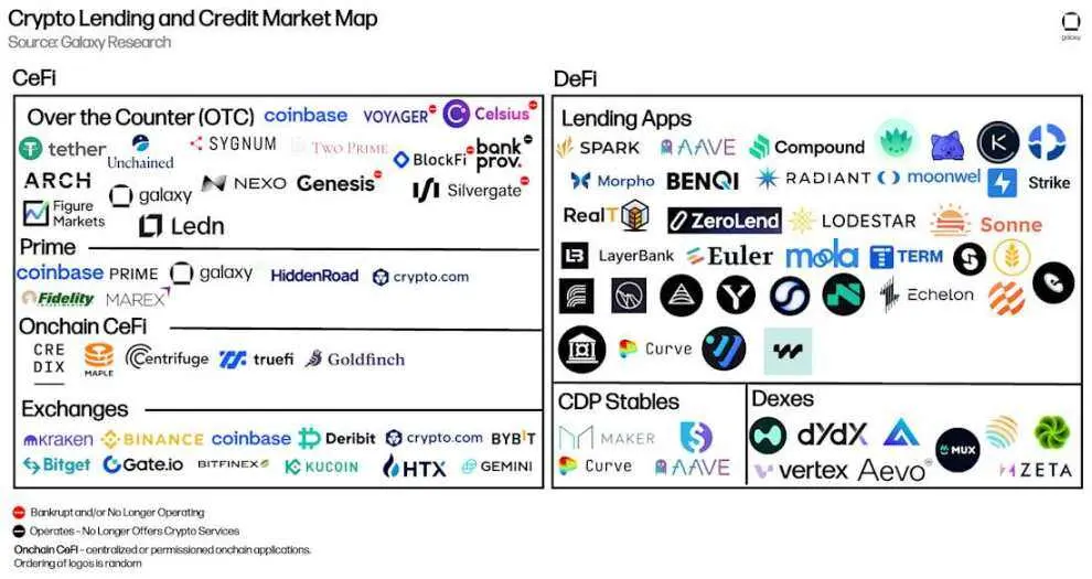 以下展示了 CeFi 和 DeFi 加密货币借贷市场的主要参与者。随着加密货币资产价格暴跌和流动性枯竭,一些按贷款规模计算的大型 CeFi 贷款机构在 2022 年和 2023 年崩溃。这些贷款机构在用红色警示点标注。自 Galaxy 上一份加密货币杠杆报告发布以来,我们新增了 5 个 DeFi 应用、1 个 CeFi 贷款机构和 1 种抵押债务头寸(CDP)稳定币。
