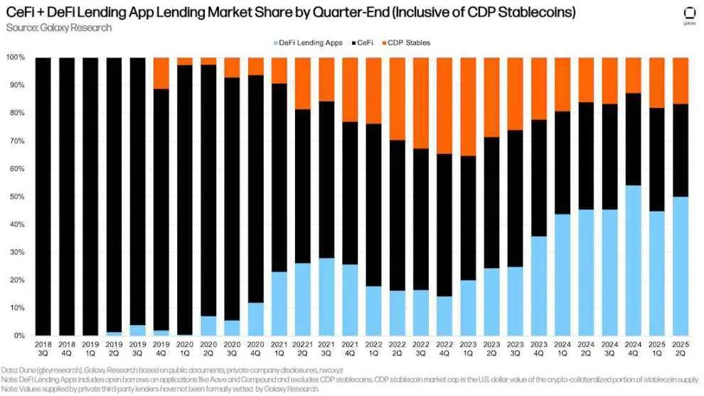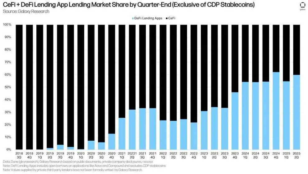 由于 DeFi 借贷应用未偿还借款的季度环比增长,其对 CeFi 借贷平台的领先优势再次接近 2024 年第四季度的历史高点。截至 2025 年第二季度末,DeFi 借贷应用在 CeFi 借贷平台中的占比为 59.83%,高于 2025 年第一季度的 54.56%,但较 2024 年第四季度的高点(61.99%)下降了 216 个基点。