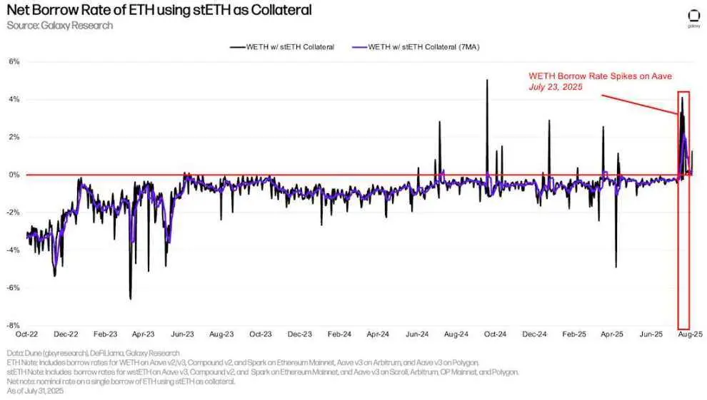通过使用流动性质押代币(LSTs)或流动再质押代币(LRTs)作为抵押品(这些代币可产生收益),用户可以以较低(甚至为负)的净借款利率获得 ETH 贷款。这种成本效率推动了循环策略的实施:用户反复使用 LSTs 作为抵押品借入未质押的 ETH,质押后再将生成的 LSTs 用于借入更多 ETH,从而放大对 ETH 质押年利率的敞口。这种策略仅在 ETH 的借款成本低于 stETH 的质押年利率时有效。大多数情况下,用户可以顺利实施这一策略。然而在 7 月 15 日至 7 月 25 日期间,Aave V 3 Core 上的 ETH 提取量接近 30 万枚,导致 ETH 借款利率飙升,从而使循环策略无利可图(下图中净利率持续高于 0%)。