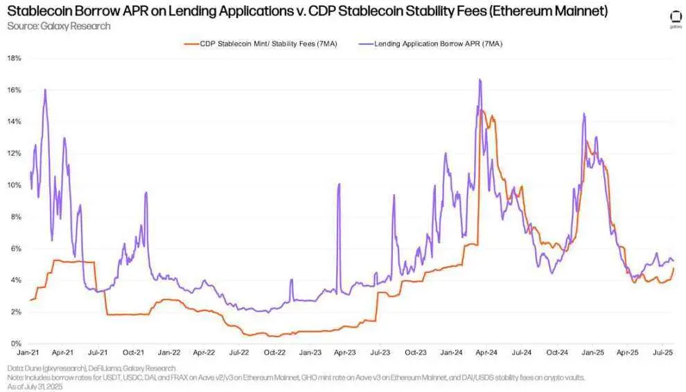 加权平均稳定币借款利率从 3 月 31 日的 4.7% 小幅上升至 7 月 31 日的 4.96%(使用加权平均稳定币借款利率和 CDP 稳定币铸造费用的七日移动平均值)。这一小幅上升是由于借款活动略有增加,而稳定币借贷市场参数几乎没有调整。自 2025 年 3 月中旬以来,Aave(稳定币的最大流动性中心)的稳定币利率一直未变。
