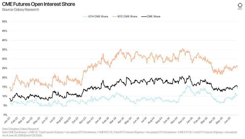 截至 6 月 30 日,CME 的以太坊未平仓合约占比(计算方式为 CME 以太坊未平仓合约除以市场总未平仓合约)为 10.77%。较 2025 年第一季度末上升 218 个基点,较 2025 年 1 月 1 日下降 118 个基点。类似地,CME 的比特币未平仓合约占比在第二季度上升 380 个基点至 26.32%,较年初下降 152 个基点。