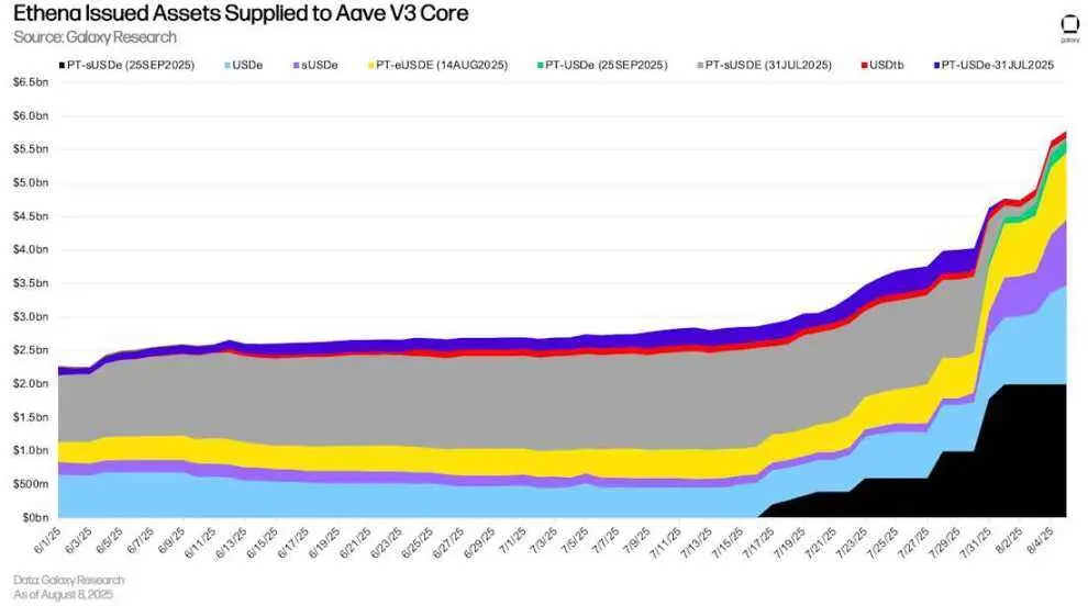 截至 8 月 8 日,Aave V 3 Core 上有价值 57.9 亿美元的 Ethena 发行资产,其中 55.88% 为 Pendle PT 代币。此外,USDe(Ethena 的合成美元)和 sUSDE(质押 USDe,其收益来自 USDe 的底层抵押品)的总额为 24.5 亿美元。