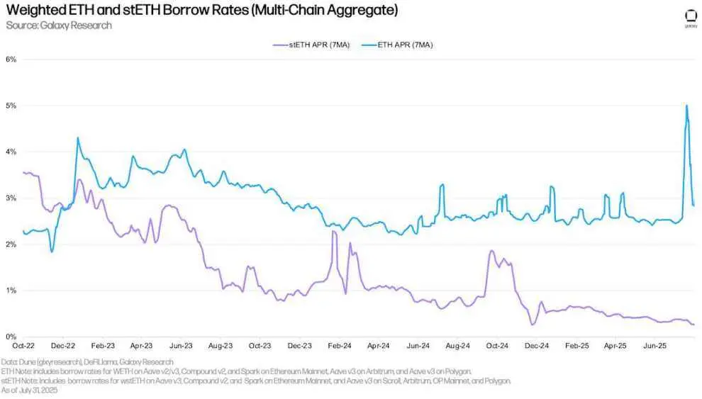 下图显示了跨多个应用和链的 ETH 和 stETH(Lido 协议上的质押 ETH)的加权借款利率。历史上,ETH 的借款成本高于 stETH,因为用户借入 ETH 以实施循环策略,从而获得对以太坊网络质押年利率的杠杆敞口(使用 stETH 作为抵押品)。因此,ETH 的借款年利率通常围绕以太坊网络质押年利率波动 30-50 个基点。当借款成本超过质押收益时,这种策略将变得不经济,因此 ETH 借款年利率很少长期高于质押年利率。然而,7 月 ETH 借款利率大幅飙升,原因是 Aave V 3 Core 上的大量 ETH 被提取。下文将详细讨论这一事件的影响。