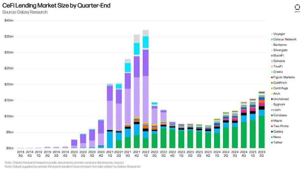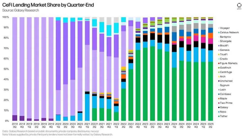 Tether、Nexo 和 Galaxy 是 Galaxy Research 追踪的未偿还贷款价值排名前三的贷款机构。截至 6 月 30 日,Tether 的未偿还贷款为 101.4 亿美元,Nexo 为 19.6 亿美元,Galaxy 为 11.1 亿美元。