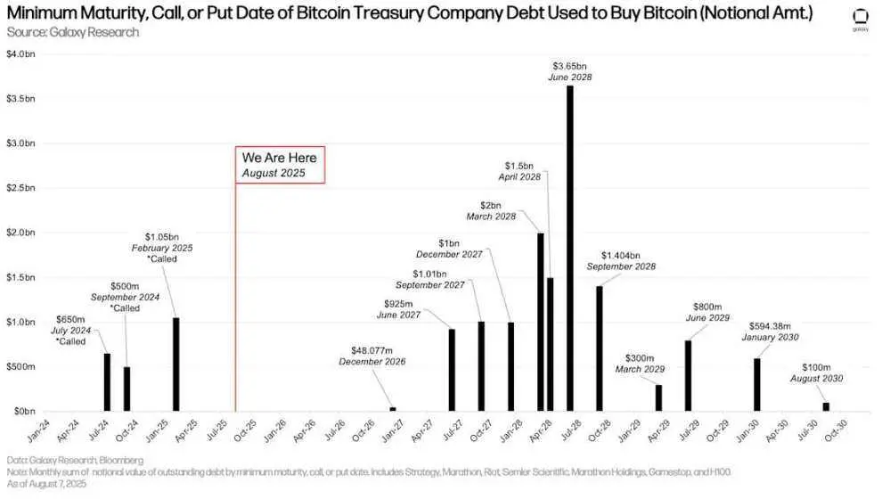 由于比特币 DATCOs 未发行新债务,可追踪数据的储备公司的未偿还债务余额未发生变化。尽管如此,2028 年 6 月仍是需要关注的月份,届时将有 36.5 亿美元的未偿还债务到期。