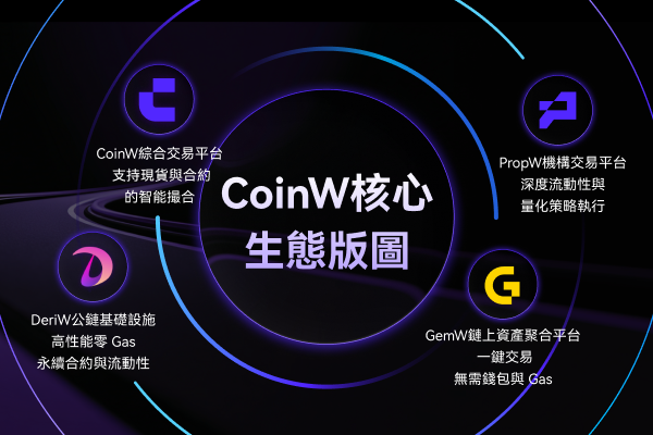 完成全栈融合升级后, CoinW 所投资与布局的生态系统由四大核心板块组成。各板块在功能与服务上各自形成完备体系,能够精準覆盖不同类型使用者在交易与资产管理上的多元需求。