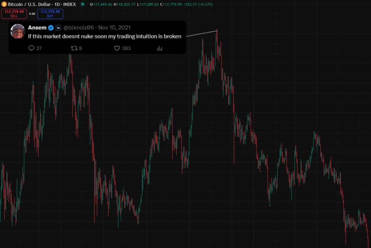 在历史最高点时的推特信息流看起来很疯狂。要是连最厉害的人都没法在顶部卖出,你也一样做不到。做好相应准备吧。