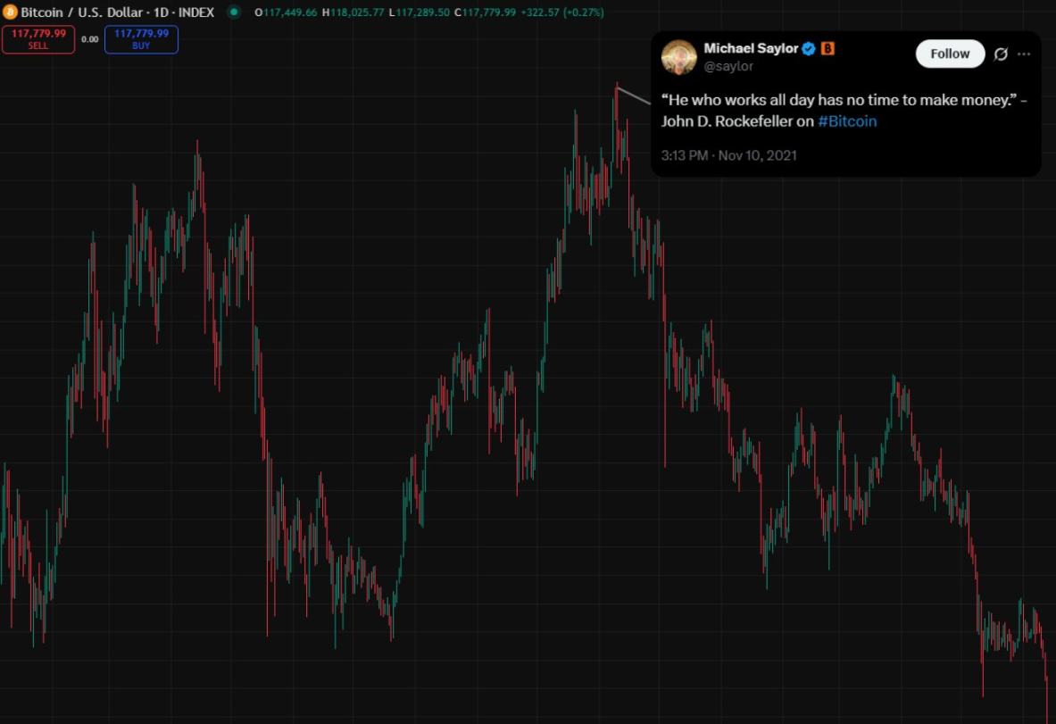 原文:"He who works all day has no time to make money." - John D. Rockefeller on #Bitcoin