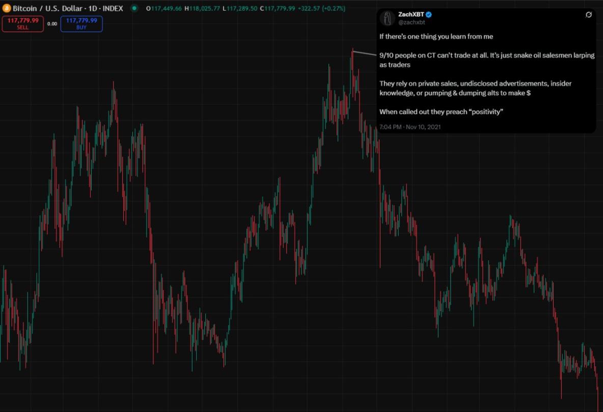 如果你们能从我的话里学到一件事,那就是加密推特(CT)上十分之九的人根本不会交易。他们只是些装成交易员的江湖骗子。