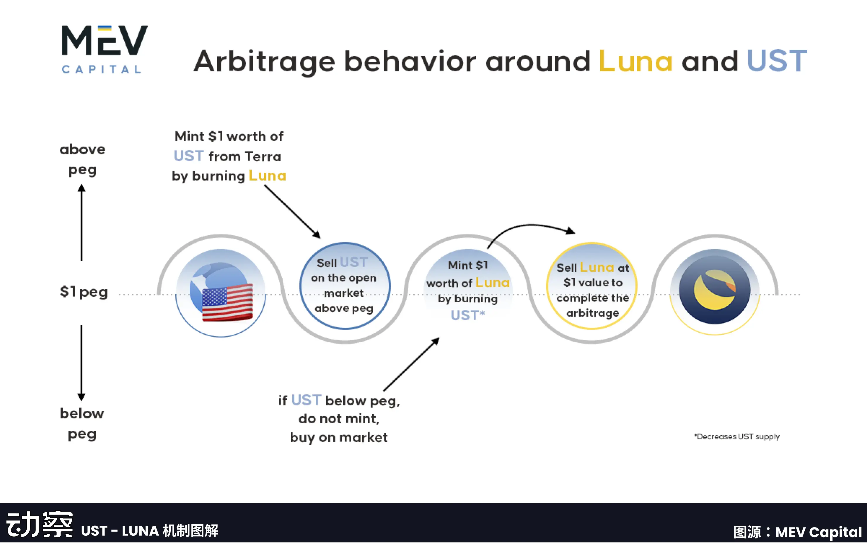 两者之间的关系就像一个跷跷板:当 UST 价格高于 1 美元时,系统会铸造更多 UST 并销毁 Luna,从而增加 UST 的供应量,压低其价格;当 UST 价格低于 1 美元时,系统会销毁 UST 并铸造 Luna,从而减少 UST 的供应量,推高其价格。