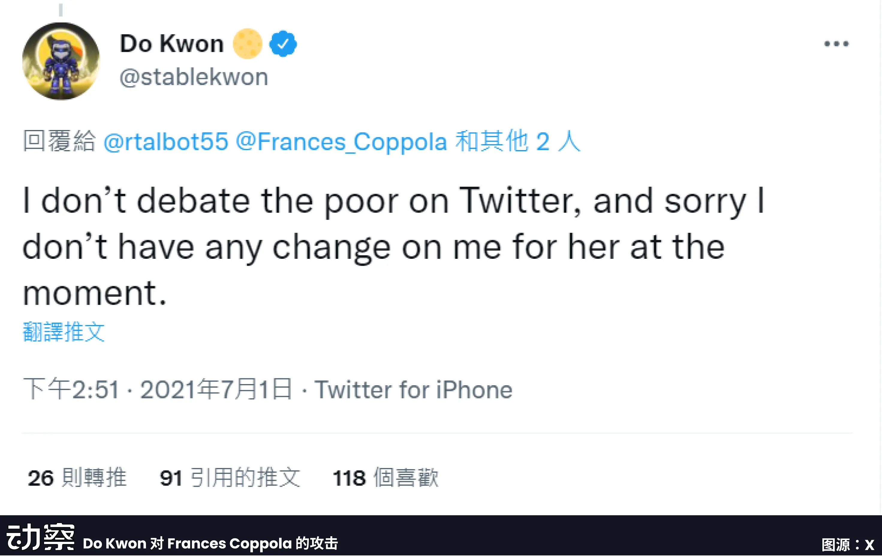 2021 年 7 月,当英国经济学家 Frances Coppola 在推特上批评算法稳定币的设计缺陷时,Do Kwon 回应道:「我不与穷人辩论,抱歉我现在身上没有零钱施舍她。」