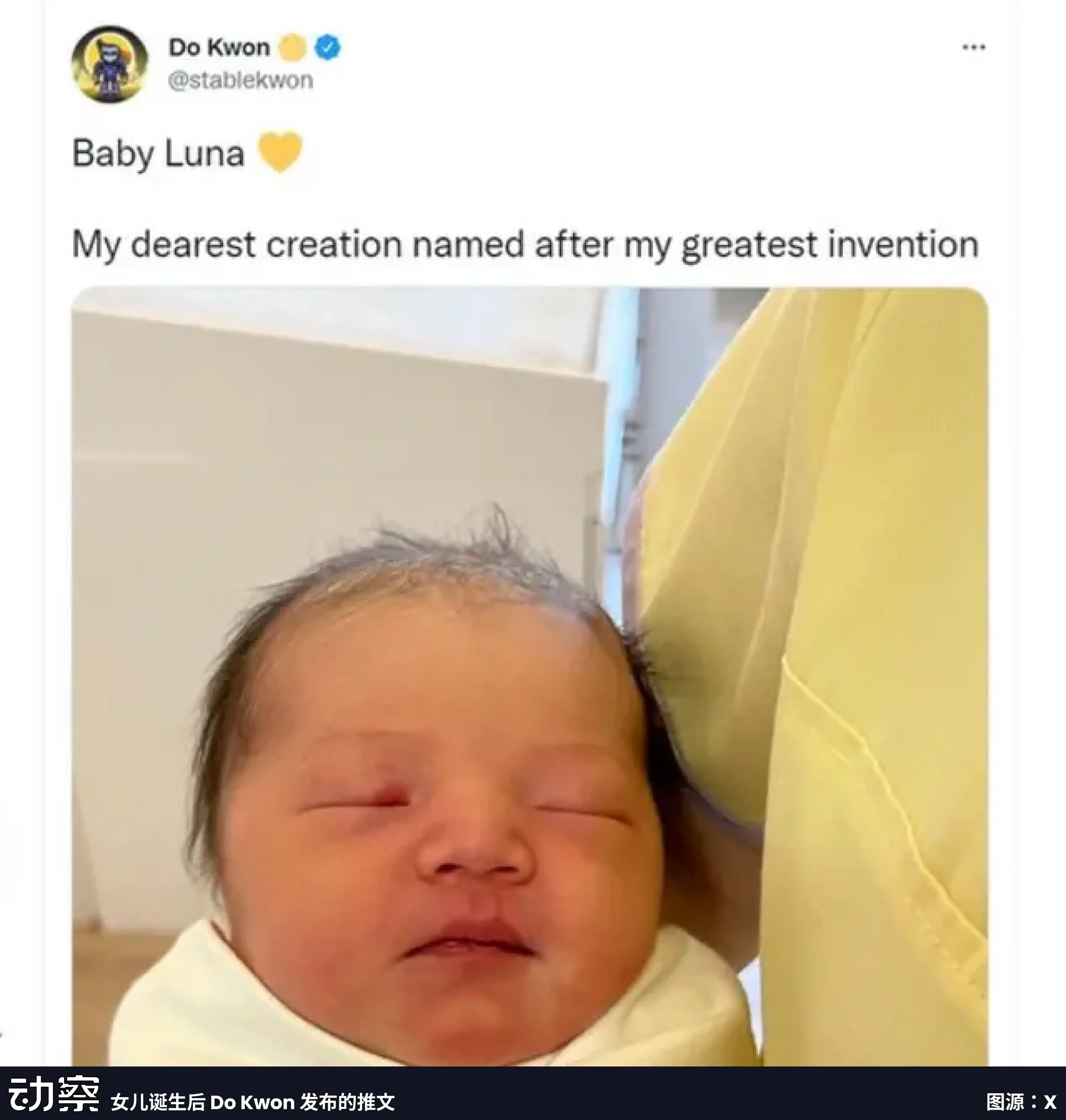 2022 年 4 月 17 日,Do Kwon 在推特上宣布女儿出生,写道:「Baby Luna,我最亲爱的创造,以我最伟大的发明命名。」
