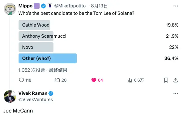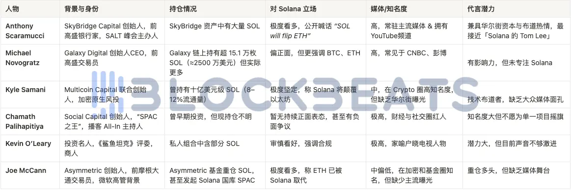综上所述,Solana 的 Tom Lee 从实际情况来看,Anthony Scaramucci 最可能胜任,他持有相当大量的「SOL Bag」且持续高调看多 Solana,且同时具备华尔街资源和媒体曝光度。虽然 Joe McCann 对 Solana 的热情和投入同样强烈,但他在华尔街和普通大众中的知名度还不及 Scaramucci。其他候选人或多或少在持仓、热度或公众形象上有所缺失,Novogratz 持有不菲 Solana 资产,且旗下 Galaxy Digital 即将发行 Solana 的 ETF,但其背后平台的因素可能更为中立,当前更专注比特币和以太坊;Kyle Samani 极为看好却缺乏传统金融资源背景,更多的是新兴投资人的身份。Palihapitiya 和 O』Leary 虽有号召力,却没有持续为 Solana 领航的行动线。