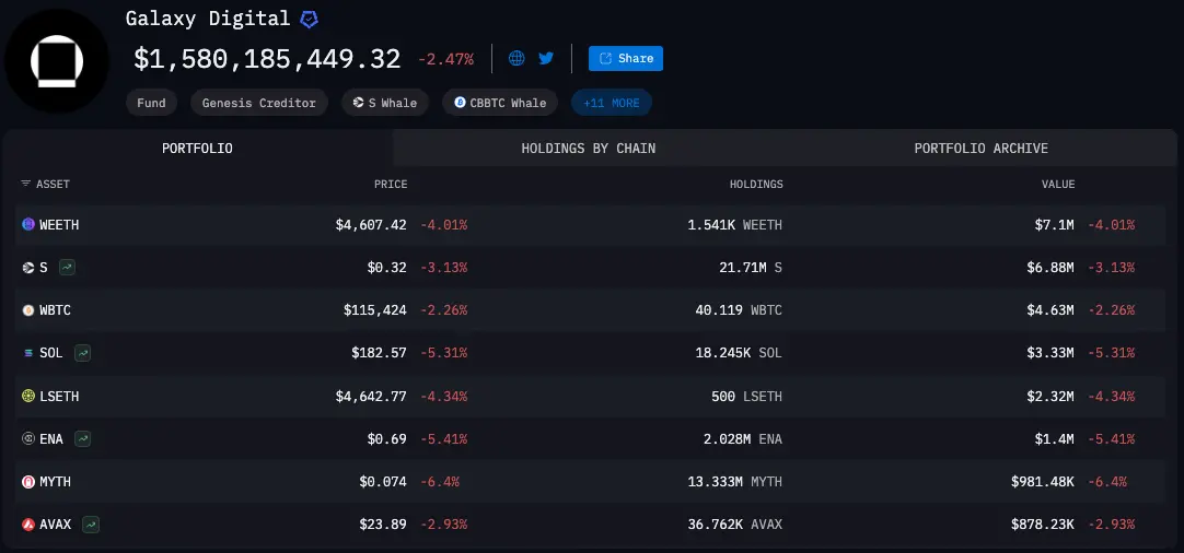 而其中投资者将需要支付 Galaxy 1% 的管理费,投资将通过质押提供收益,仅一笔交易便为其带来了数百万美元的收益。但这并不算什么,2024 年 3 月 31 日公布的公司财报显示 Galaxy Digital 对其 Crypto Vol 基金投资了 1.041 亿美元,其中包括从 FTX 资产收购 Solana,这意味着这笔交易中 Galaxy 自身可能至少投资了数千万美元,若以 64 美元计价至今该笔交易已经让其投入的资金翻了 3 倍以上。根据 Arkm 的数据来看,当前 Galaxy Digital 的主钱包 SOL 持仓 330 万美元,而根据分析其链上共持有 151,196 枚 SOL,总价值达 2500 万美元,加上其转入中心化交易平台的数千万美元 SOL「不知去向」,以及其他持仓的地址,最终真实持有的数量可能远远超过这个数字。