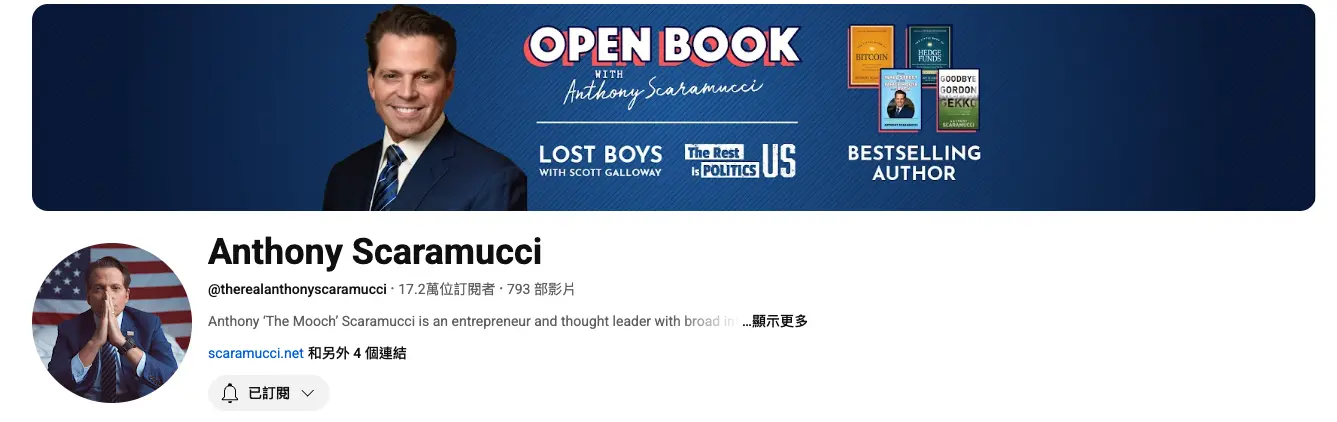 Anthony Scaramucci 可以说是华尔街最坚定的 Solana Maxi 之一,他曾是高盛投资银行家,后于 2005 年创立对冲基金公司 SkyBridge Capital,并因短暂担任白宫通讯主任 1 mooch(11 天)而闻名。他通过主办年度 SALT 峰会汇聚华尔街领袖,在金融圈积累了深厚人脉。作为资深基金经理,Scaramucci 勇于拥抱新兴资产,多次在市场低迷时逆势投资,使其成为华尔街具有远见的投资代表人物之一。近年他积极投身加密领域,将 SkyBridge 部分资本转向比特币、以太坊、Solana 等,并亲自下场为加密行业站台,提升了他在加密社区的知名度。而除了人脉,他还拥有自己的 17 万人订阅的 Youtube 频道,从传播途径上来说也有相当的影响力。