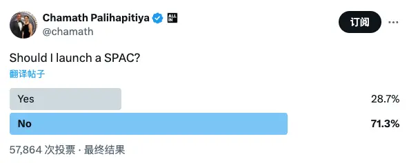 而 Palihapitiya「做局割韭菜」这一论点并非空穴来风,自 2020 年以来 Palihapitiya 操盘的 SPAC 达数十个,包括 Virgin Galactic、Opendoor Technologies、Clover Health、SoFi Technologies 等,但大多投资者在其操盘的项目中都很难挣到钱,计算后得知如果有人拿 100 美元投资他所有 SPAC 的项目, 到现在为止亏损已经超过 70% 。而在 X 上投票得到悬殊数量的 NO 以后也让他在自己的评论区爆出了金句「No crying in the casino!!」,有社区成员猜测随着「币股公司」的热潮,Palihapitiya 这一举应该是想要结合自己的华尔街人脉资源,借壳上线「某个加密代币」的上市公司,但事实缺乏考证。