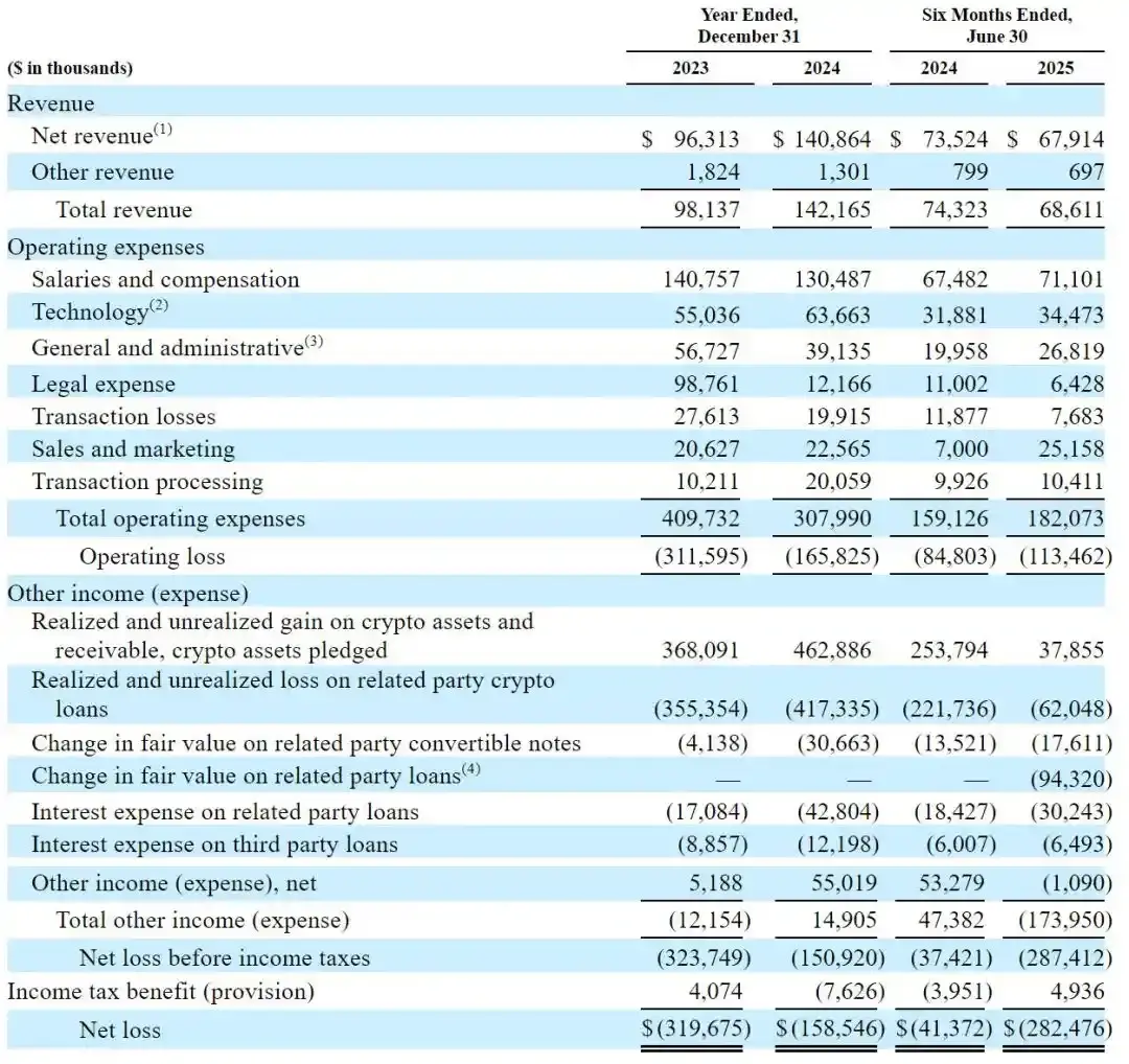 值得注意的是,Gemini 在财务上正处于阵痛期。根据 S-1 文件,截至 2025 年 6 月的半年内,公司收入为 6860 万美元,但净亏损高达 2.825 亿美元,远超去年同期的 4140 万美元。交易费依然是最主要收入来源,约占 2025 年上半年总收入的 66%;此外 Gemini 还提供托管、质押与稳定币 GUSD 发行等服务。