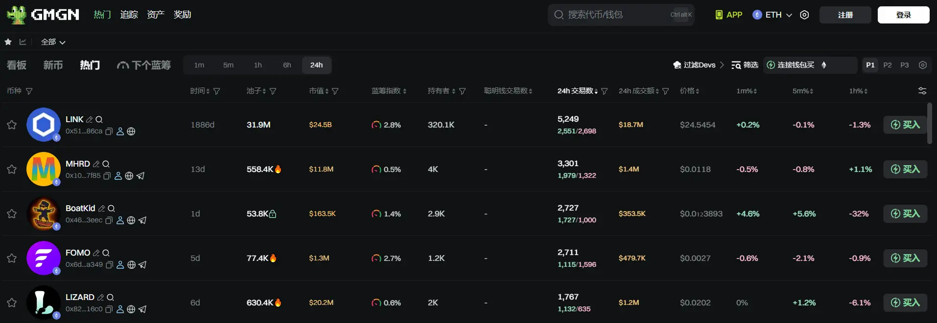 过去 24h 以太坊热门代币前五依次为:LINK、MHRD、BoatKid、FOMO、LIZARD