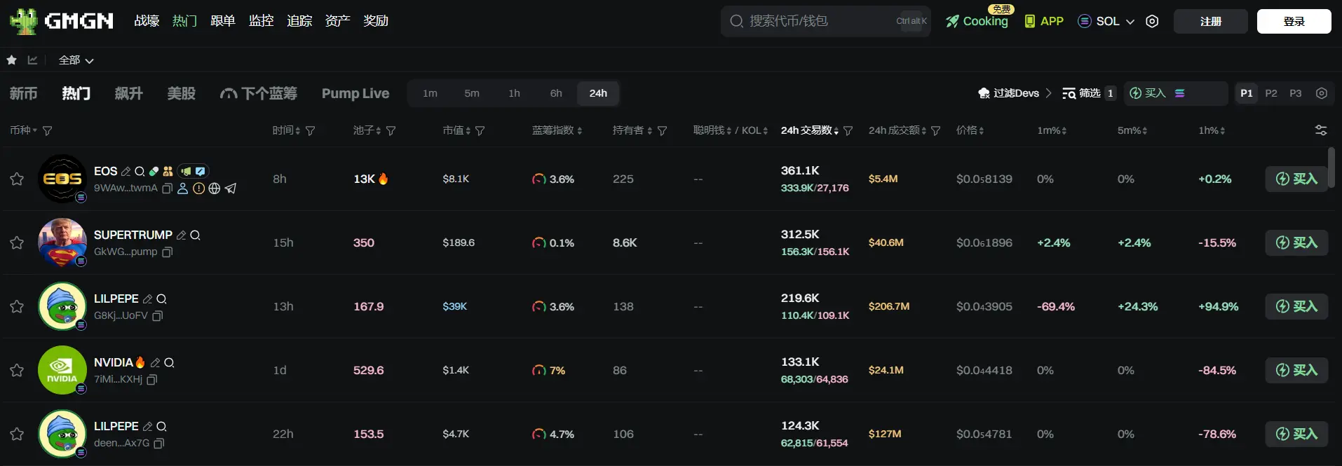 过去 24h Solana 热门代币前五依次为:EOS、SUPERTRUMP、LILPEPE、NVDIA、LILPEPE