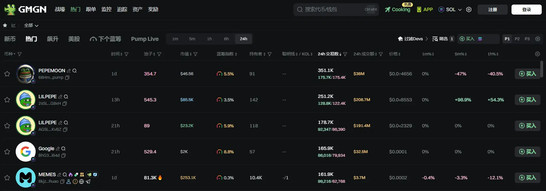 过去 24h Solana 热门代币前五依次为:PEPEMOON、LILPEPE、LILPEPE、Google、MEMES