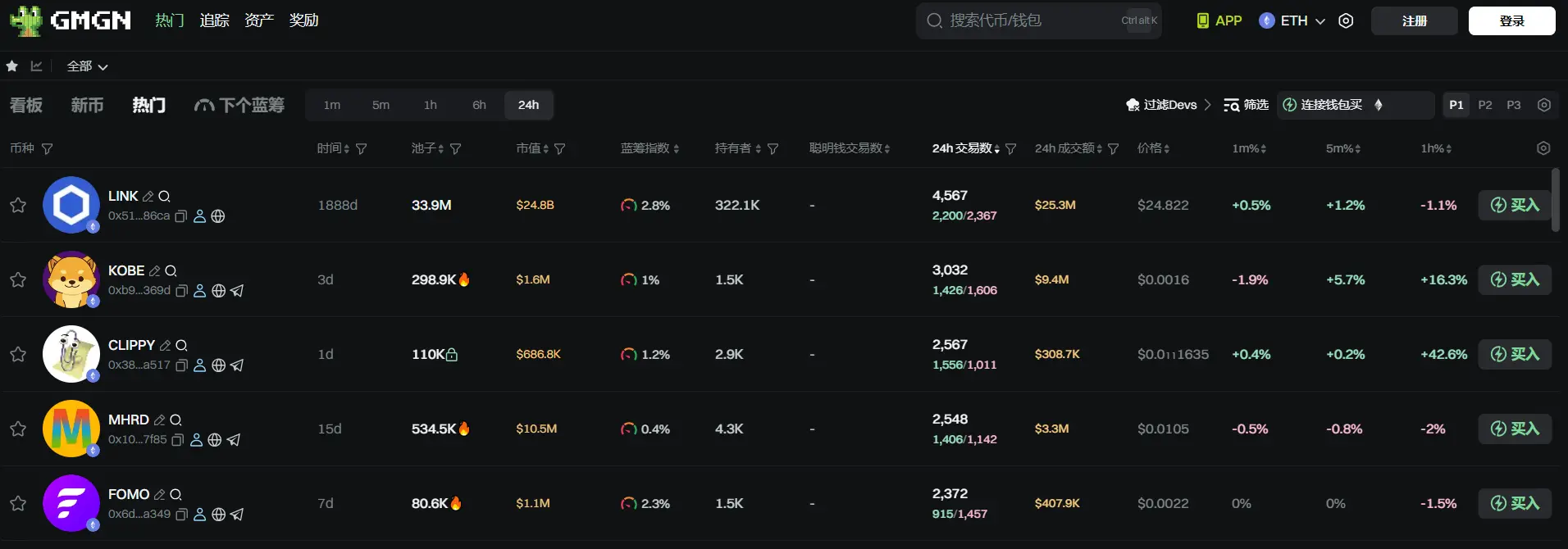 过去 24h 以太坊热门代币前五依次为:LINK、KOBE、CLIPPY、MHRD、FOMO