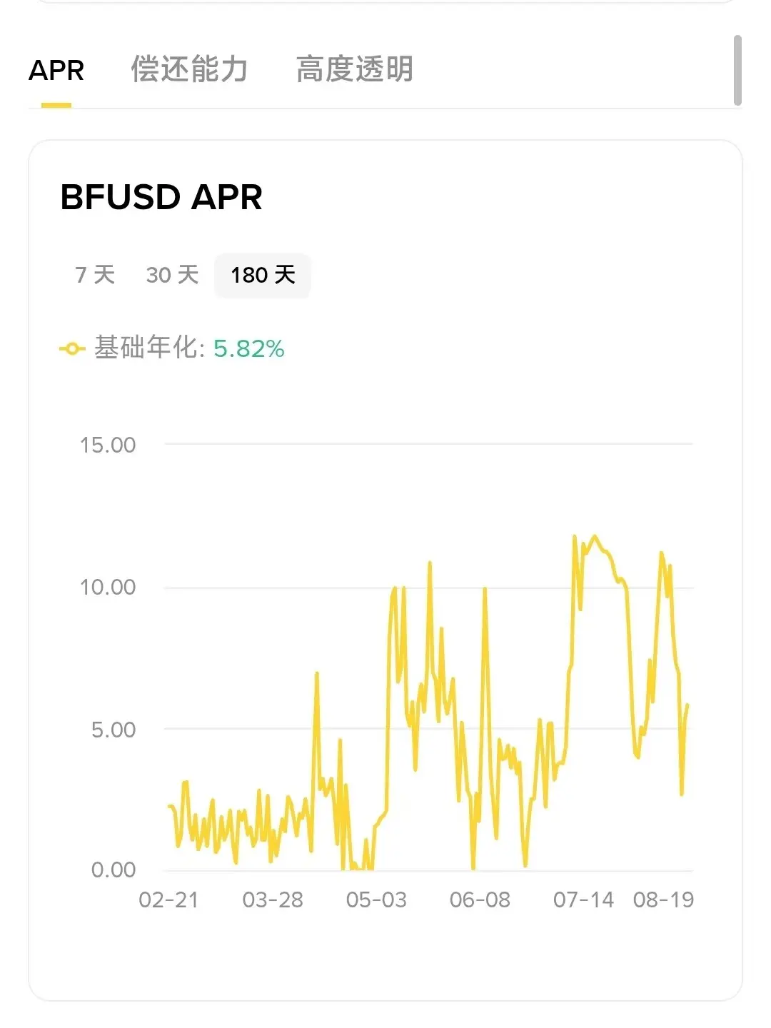 至于 benmo.eth 所提到的 BFUSD, 则是币安专为合约用户推出的奖励性保证金资产,用户仅需持有 BFUSD 即可持续赚取收益,同时也将该稳定币作为合约账户的保证金,实现“边用边赚”。 如下图所示,虽然当下 BFUSD 基础年化“仅”报 5.82%,但数据回溯显示也曾多次突破 10%。