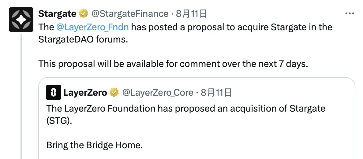 关于 LayerZero 对 Stargate 的收购提案,可追溯至 8 月 11 日 —— 参考阅读《 LayerZero 提议收购 Stargate:代币双双暴涨 20%+,但这一群体却强烈反对 》。
