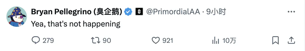 截至发文, 有别于 LayerZero 提出收购后双方频频互动的“和谐景象”,在 Wormhole 提出有意收购后,Stargate 官方推特没有发布任何一条相关动态,而 LayerZero 方面也仅有联合创始人 Bryan 疑似回应了一句:“这不可能发生。”